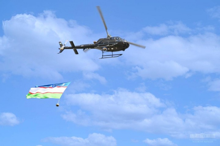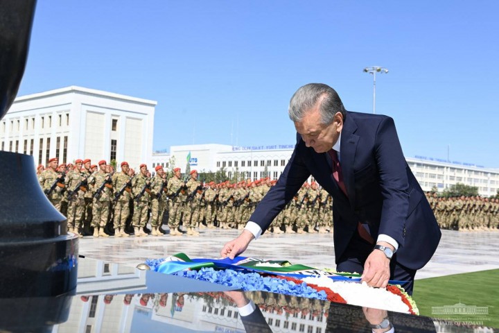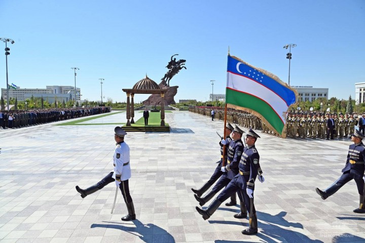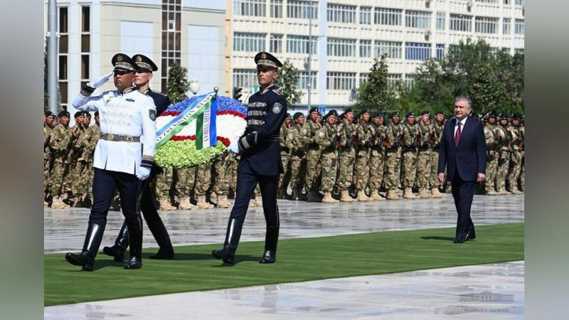 Перед статуей под звуки марша «Джалолиддин Мангуберди» торжественным строем прошла рота Почетного караула Национальной гвардии.