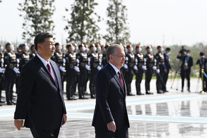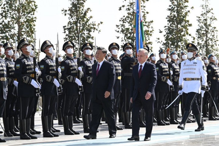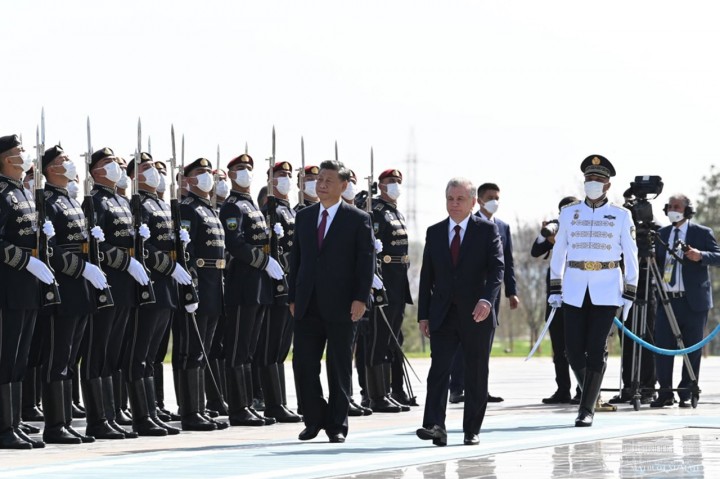 Президент Узбекистана Шавкат Мирзиёев и Председатель Китая Си Цзиньпин поднялись на специальный подиум. Прозвучали государственные гимны двух стран. Почетный караул торжественным маршем прошел перед главами государств.