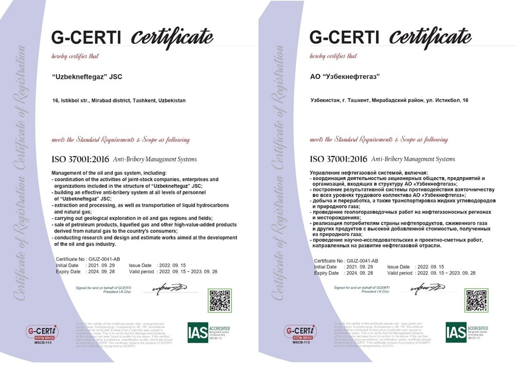 В результате проделанной эффективной работы в сентябре 2021 года АО «Узбекнефтегаз» получил международный сертификат соответствия системы менеджмента противодействия коррупции «ISO 37001:2016». В текущем году данный сертификат прошел контрольный аудит.