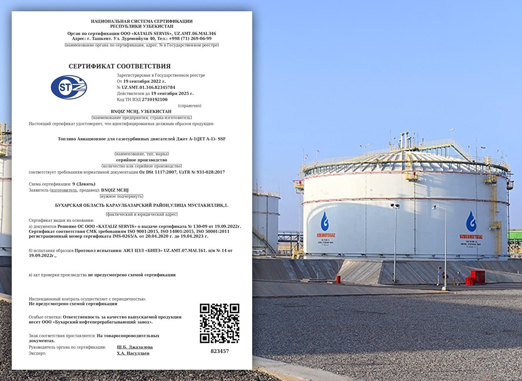 19 сентября текущего года в Национальной системе сертификации Республики Узбекистан проведена сертификация новой продукции – топлива авиационного для газотурбинных двигателей Jet A-1 (Jet A-1)-SSF и получен сертификат соответствия.