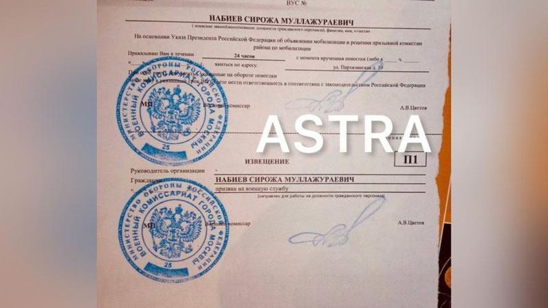 Сирож Набиев, являющийся гражданином Узбекистана, получил в Москве повестку о мобилизации в ряды Вооруженных сил России.