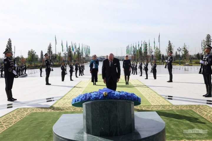 Сегодня, 28 октября утром высокий гость посетил парк "Янги Ўзбекистон" и возложил цветы к подножию Монумента независимости.