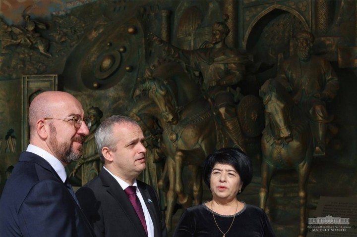 В резиденции "Куксарой" Шарля Мишеля встретил Президент Узбекистана Шавкат Мирзиёев. Состоялось совместное фотографирование.