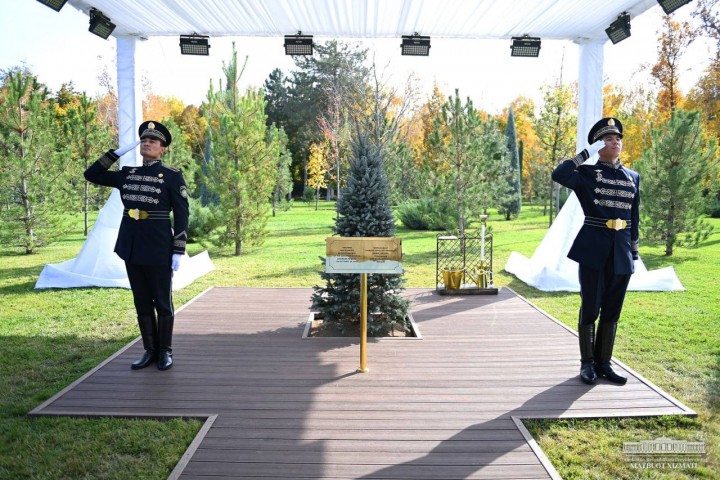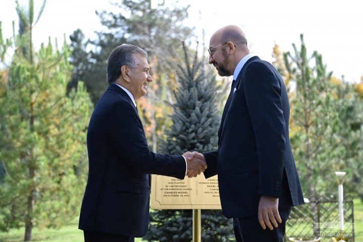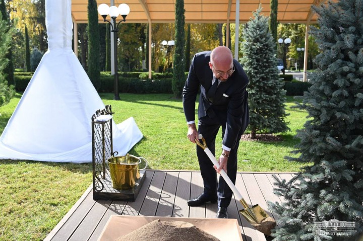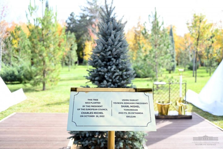 Президент Европейского совета Шарль Мишель в присутствии Президента Республики Узбекистан Шавката Мирзиёева посадил дерево на Аллее почетных гостей в резиденции «Куксарой».