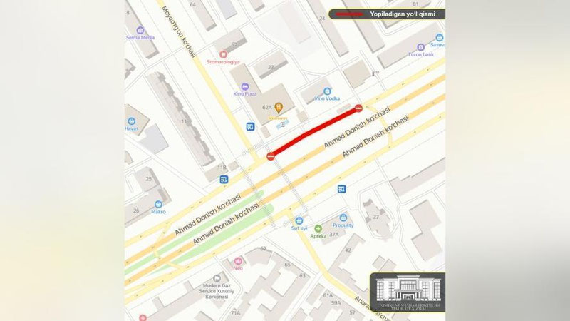 В связи с дорожно-ремонтными работами часть улицы Ахмада Дониша на участке от съезда на дублёр до улицы Мойкурган будет закрыта для движения транспорта со 2 ноября до 19:00 часов 3 ноября.