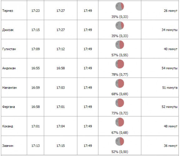 Стоит отметить, что в Ферганской долине данное затмение будет наблюдаться дольше чем в других регионах страны - 52 минуты, меньше всего в Нукусе - 7 минут.