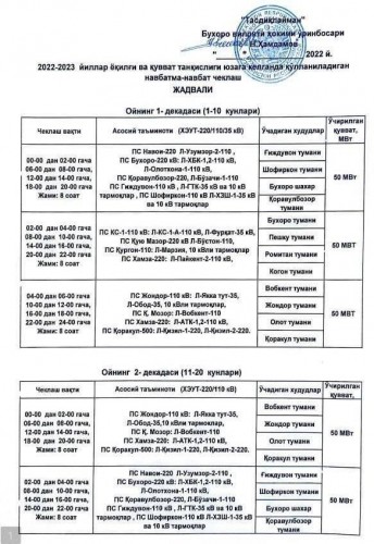 АО «Бухарское региональное предприятие электрических сетей» напомнило, что производство электроэнергии и ее потребление происходят одновременно. Поэтому невозможно создать резерв электроэнергии. По этой причине в целях обеспечения баланса электроэнергии в периоды дефицита топлива и мощностей в энергосистеме, а также предупреждения возникновения аварийных ситуаций в энергосистеме и крупной аварии с тяжелыми последствиями, в регионах составляются графики отключений света.