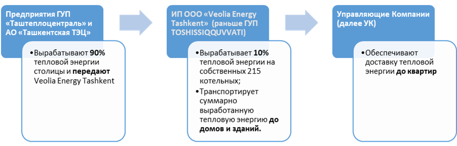- Veolia Energy Tashkent - транспортирует тепловую энергию через тепловые сети от ГУП «Таштеплоцентраль» / АО «Ташкентская ТЭЦ» до цоколя или элеваторного узла отопления дома;