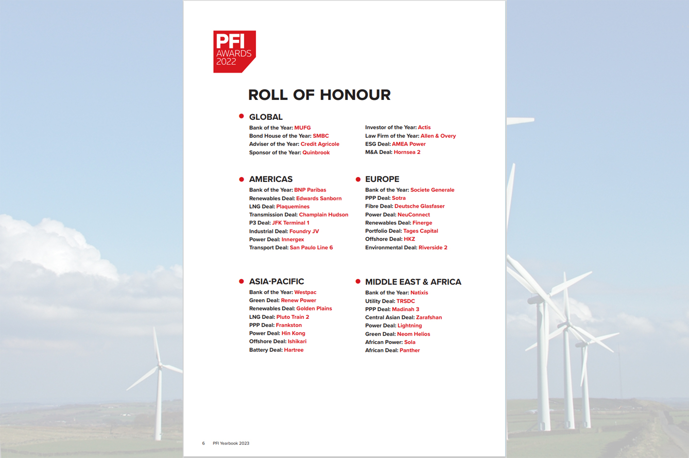 Премия PFI (Project Finance International) Awards – одна из самых престижных наград в области проектного финансирования, ежегодно присуждаемая за лучшие сделки проектного финансирования в Европе, США, Азии, Ближнем Востоке и Африке.