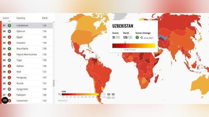 Узбекистан занял 126-е место среди 180 стран мира. За год наша страна поднялась на 14 позиций, улучшив результаты на три балла (в 2021 году Узбекистан занимал 140-е место). Наша страна отмечена в этом индексе как государство, которое демонстрирует темпы роста за последние шесть лет (с 22 баллов в 2017 году до 31 балла в 2022 году) среди стран, систематически осуществляющих антикоррупционные реформы в Восточной Европе и Центральноазиатском регионе. Индекс восприятия коррупции представляет собой рейтинг 180 стран и территорий мира по восприятию коррупции в государственном секторе и рассчитывается на основе данных, полученных из 13 внешних источников. В нем используется шкала от нуля до 100, где 0 соответствует крайне высокому уровню коррупции, а 100 - крайне низкому.