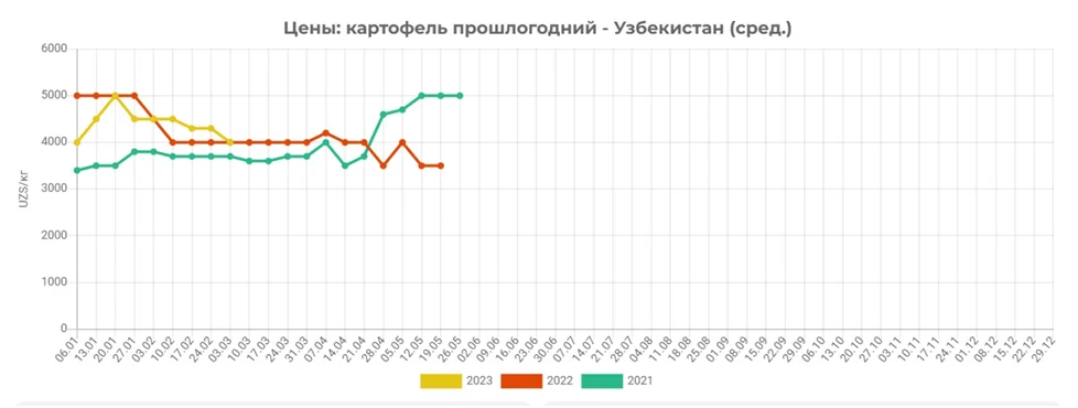 Между тем, оптовые цены на прошлогодний картофель в Узбекистане вернулись к уровням начала текущего года. Во второй декаде января 2023 года оптовые цены на прошлогодний картофель отреагировали на аномальные для этого региона холода резким повышением – с 4000 до 5000 сум/кг, так же как и другие виды овощей. Однако, за последние полтора месяца оптовые цены постепенно вернулись прежним уровням – с 20 января по 3 марта 2023 года средняя оптовая цена на эту продукцию снизилась с 5000 до 4000 сум/кг (с $0,44 до $0,35).