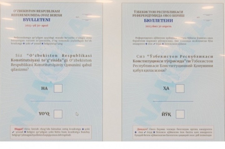 На основании статьи 29 Закона «О референдуме Республики Узбекистан» в бюллетень для голосования на референдуме включен вопрос, выносимый на референдум в соответствии с постановлениями Законодательной палаты Олий Мажлиса от 10 марта 2023 года и Сената Олий Мажлиса Республики Узбекистан от 14 марта 2023 года и указываются варианты волеизъявления голосующего «да» или «нет». Бюллетень для голосования содержит разъяснение о порядке его заполнения.