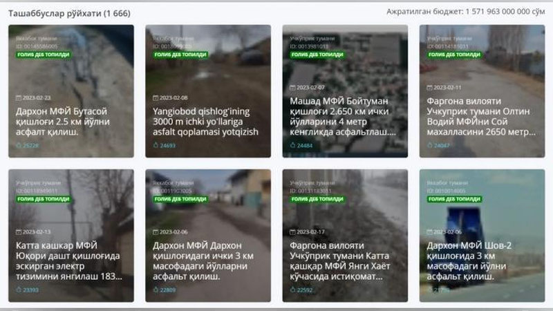 За 33 680 инициатив по всей стране через портал «OpenBudget» было подано более 16 миллионов голосов. Голосование длилось с 10:00 18 марта до 10:00 7 апреля этого года.