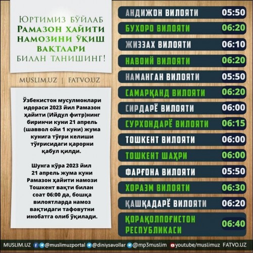 Также опубликовано время праздничного намаза в различных регионах страны: