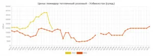 Учитывая, что цены на эту продукцию падают вторую неделю подряд, с 7 по 21 апреля 2023 года средняя оптовая цена на розовый томат снизилась с 38 000 до 20 000 сум/кг, т.е. почти в 2 раза за последние две недели. При этом текущие оптовые цены приблизились к прошлогодним уровням, по состоянию на 21 апреля 2023 года, средняя оптовая цена на эту продукцию все же на четверть дороже по сравнению с аналогичной датой прошлого года.