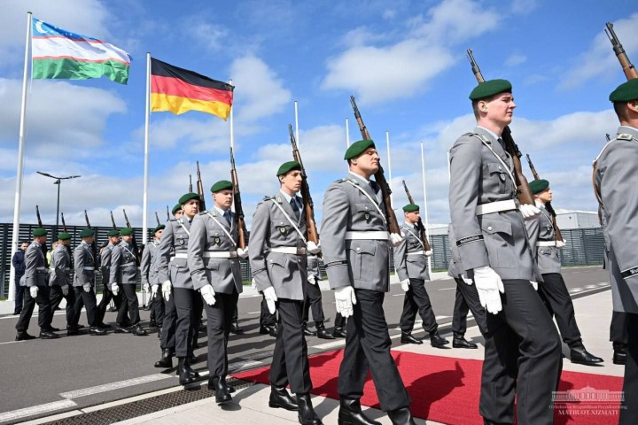 В аэропорту «Берлин-Бранденбург» к прибытию лидера Узбекистана были подняты государственные флаги двух стран, выстроен почетный караул.