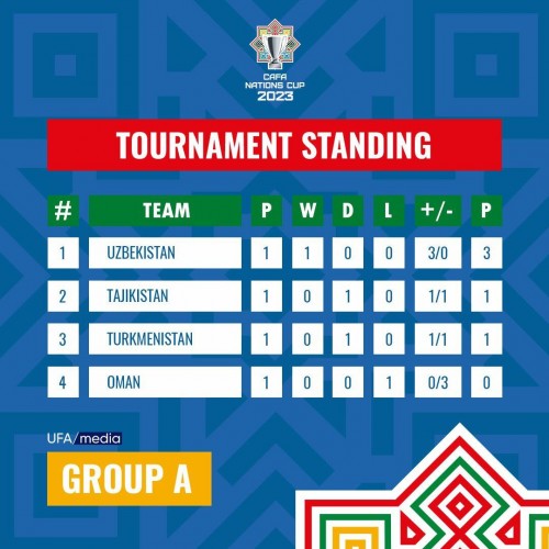 В другом матче квартета «А» сборные Таджикистана и Туркменистана разошлись миром – 1:1. Сборная Узбекистана лидирует с тремя очками в группе, по одному баллу у Туркменистана и Таджикистана, Оман с одним поражением на последнем месте.