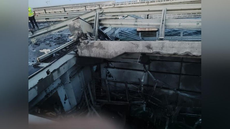 Readovka сообщила, что по Крымскому мосту был нанесен ракетный удар, в результате чего была разрушена опора и обрушены два пролета. Минтранс РФ позже уточнил, что взрыв повредил дорожное полотно со стороны Крыма. Однако конструкции пролетов, по данным ведомства, находятся на опорах.