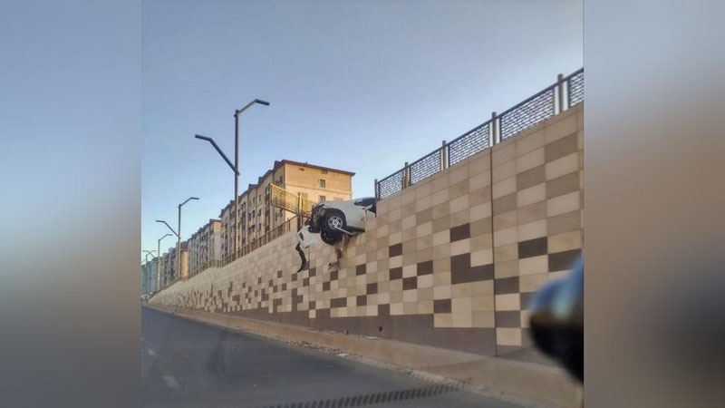 В 04:10 на путепроводе у ТАПОиЧ, улица Паркент, 21-летний водитель "Нексия-3" не справился с управлением и врезался в бетонный барьер, разделяющий дорогу. Пробив стену, передняя часть автомобиля зависла наверху над эстакадой.