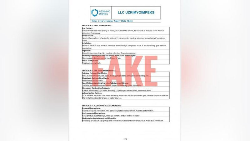 «Сообщаем, что данный договор и указанные в нем сопутствующие документы являются поддельными, - говорится в публикации на официальном сайте Минэнерго. - Между ООО «Узкимёимпэкс» и дубайской компанией «Agroyara FZCO» нет договорных отношений, а вышеупомянутые 40 тысяч тонн карбамида не были произведены в Республике Узбекистан».