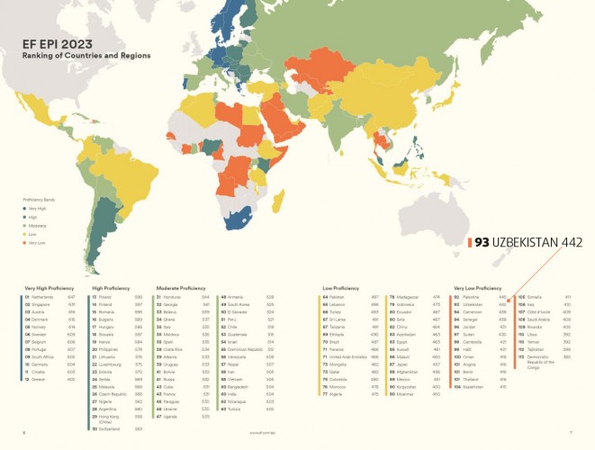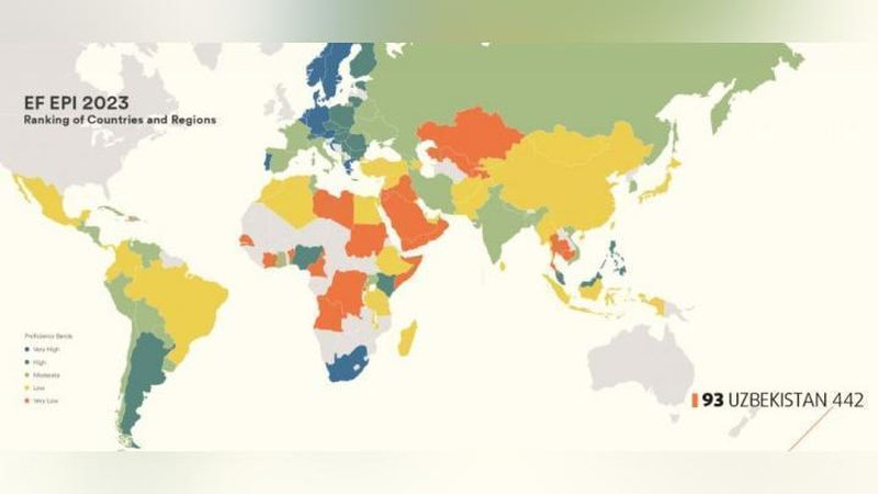 Узбекистан занимает в рейтинге EF English Proficiency Index за 2023 год 93-е место в группе "Very low proficiency" - "Очень низкий уровень владения языком".