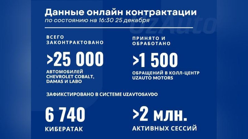 С момента открытия контрактации по состоянию на 16:30 25 декабря при помощи платформы UzAutoSavdo было успешно заключено более 25 000 контрактов.