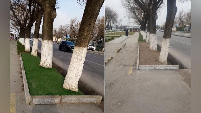 В соцсетях сообщалось, что основание деревьев вдоль дороги на 7-м квартале Юнусабадского района нашей столицы покрыто искусственным газоном.