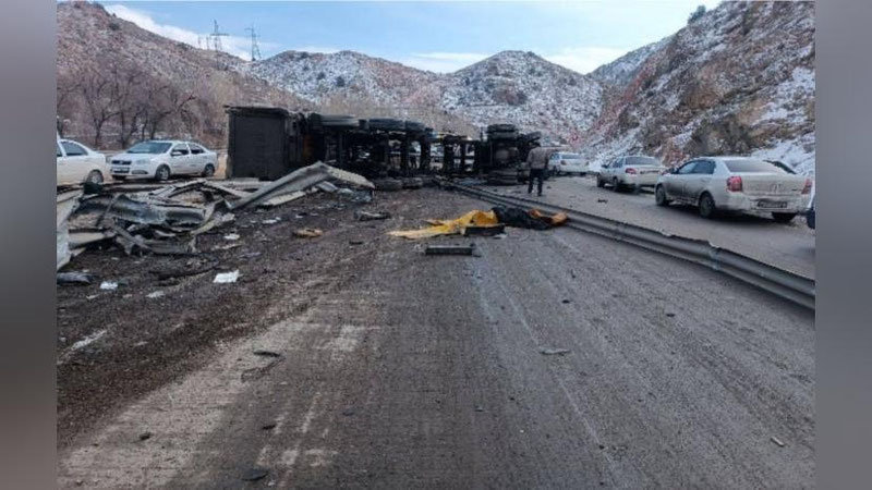 Водитель грузовика «MAN» потерял управление и врезался в железный забор посреди дороги. Грузовик опрокинулся. Об этом сообщает источник Darakchi.uz.