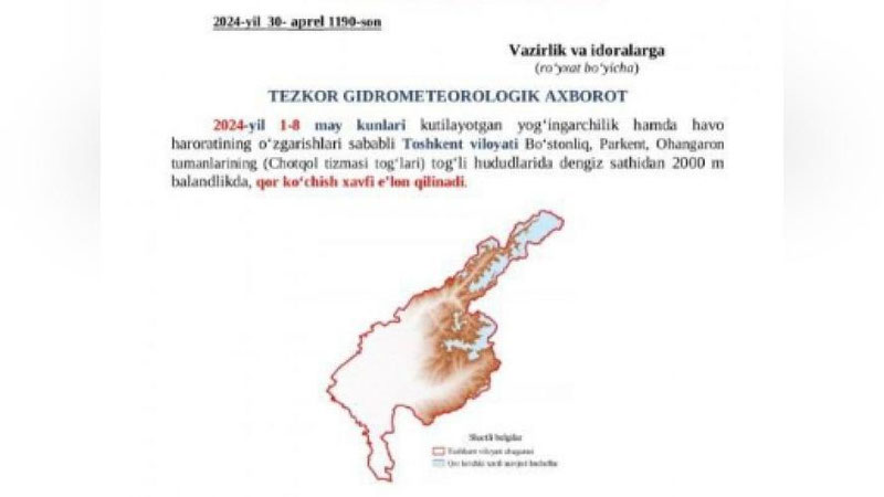"В связи с ожидаемыми осадками и изменениями температуры воздуха 1-8 мая 2024 года в Бостанлыкском, Паркентском, Ахангаранском районах (Чаткальская горная система) свыше 2000 м над уровнем моря объявляется лавинная опасность, - говорится в сообщении.
