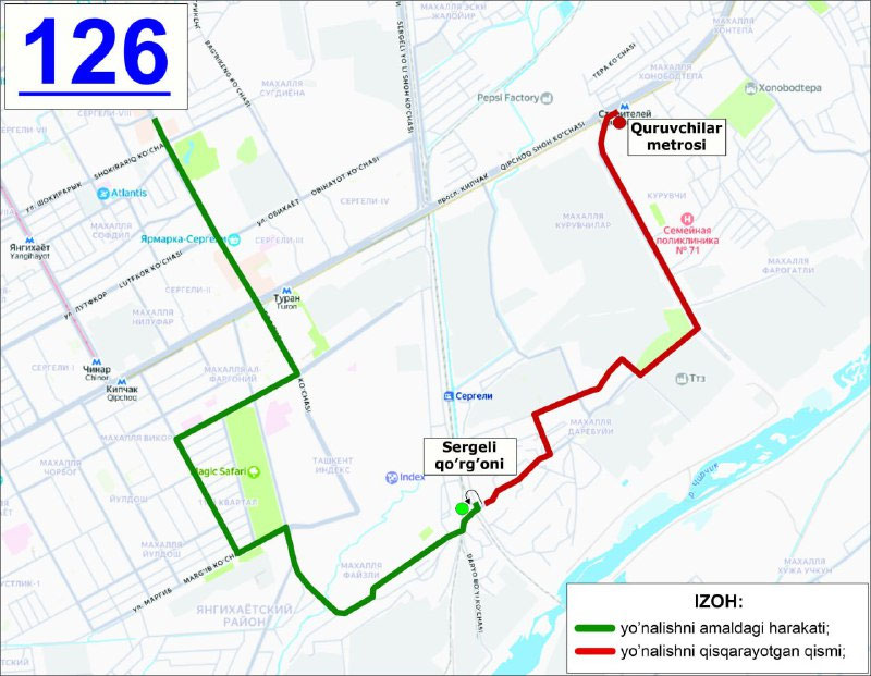 До завершения ремонтных работ движение автобусного маршрута №126 с 22 декабря 2025 года будет временно сокращено до остановки «Сергели қўрғони». Маршрут временно не будет следовать до массива «Қурувчилар» и станции метро «Қурувчилар».
