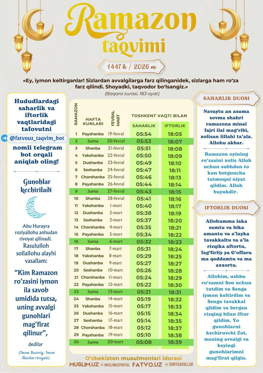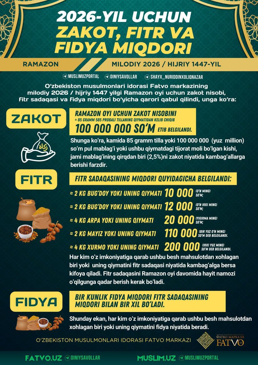Принято решение Центра фетв Управления мусульман Узбекистана по размеру нисаба закята, фитр-садака и фидьи на месяц Рамазан 2026 года (1447 год хиджры).
