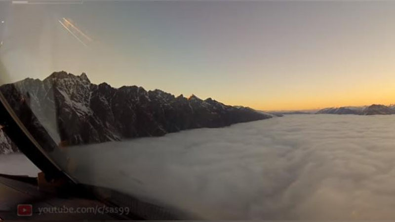Пилот авиакомпании Qatar Airway выложил видео, запечатлевшее снижающийся самолет, который "ныряет" в окруженные со всех сторон пиками гор густые облака.