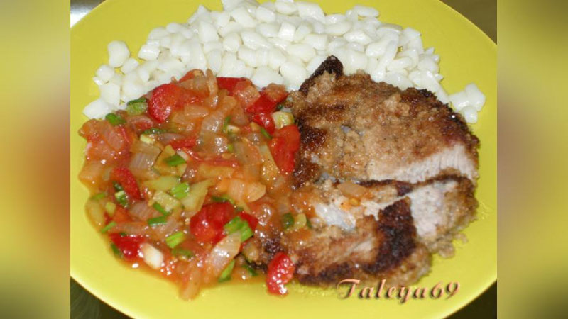 Порезать мясо кусочками по 50-70 г, добавить соль, перец, специи. Запанировать в сухарной крошке и жарить на сковороде в растительном масле под крышкой до готовности.