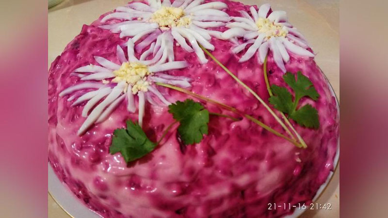 Затем трем на терке яйца. Последний слой - натертая свекла, сверху - майонез. Оставляем для пропитки на 2-3 часа в холодильнике. Татьяна ЛЕЩЕНКО