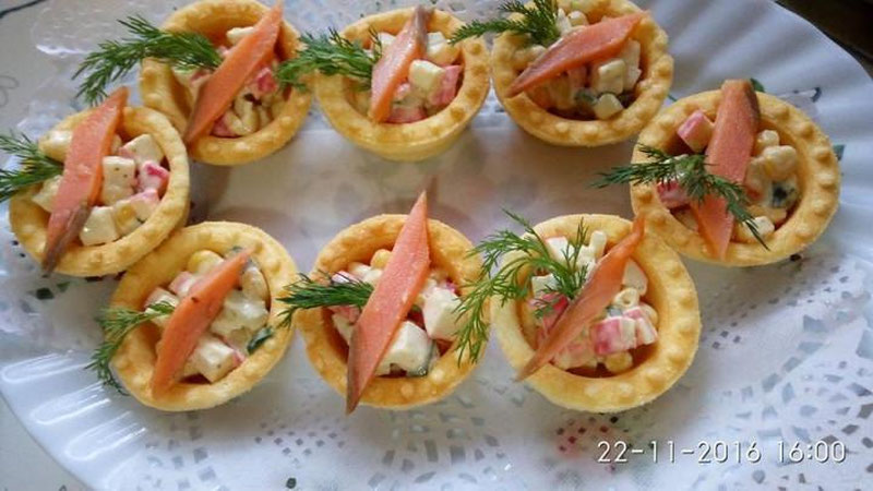 Раскладываем по корзиночкам, сверху - дольку семги и веточку укропа.