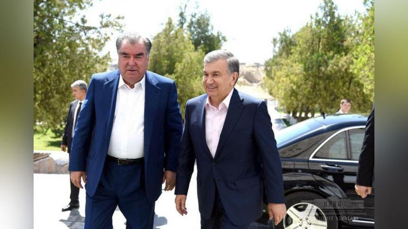 Президент Узбекистана Шавкат Мирзиёев и Президент Таджикистана Эмомали Рахмон сфотографировались на память на площади Регистан.