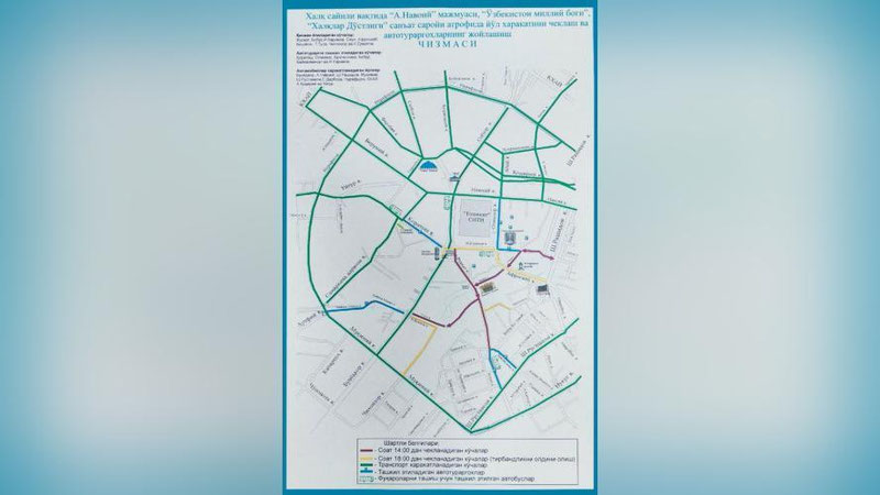 Так, в Ташкенте будет остановлено транспортное движение на следующих улицах (время закрытия обозначено на карте выше).
