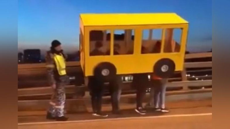 На кадрах видно, как несколько молодых людей идут по обочине, надев сверху желтую коробку, сделанную в виде автобуса. Через некоторое время к ним подходит охранник и прогоняет «транспортное средство» с проезжей части. После этого «автобус» разворачивается и двигается в обратную сторону под наблюдением охраны.