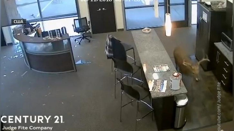 Неожиданный посетитель. В офис одной из торговых компаний Техаса ворвался испуганный олень, передает телеканал «МИР 24».