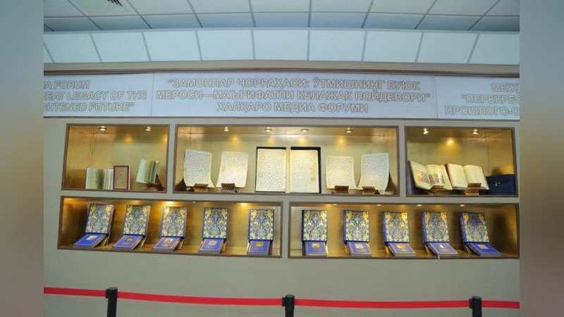 В ее экспозиции − 20 томов книг-альбомов серии «Культурное наследие Узбекистана в собраниях мира», 12 томов серии «Архитектурная эпиграфика Узбекистана», факсимиле уникальных средневековых рукописей, ныне хранящихся в различных зарубежных собраниях. В их числе - «Катталангарский Коран», «Темуртузуклари», «Зафар-наме», «Диван» Хусейна Байкара, «Мирадж-наме».