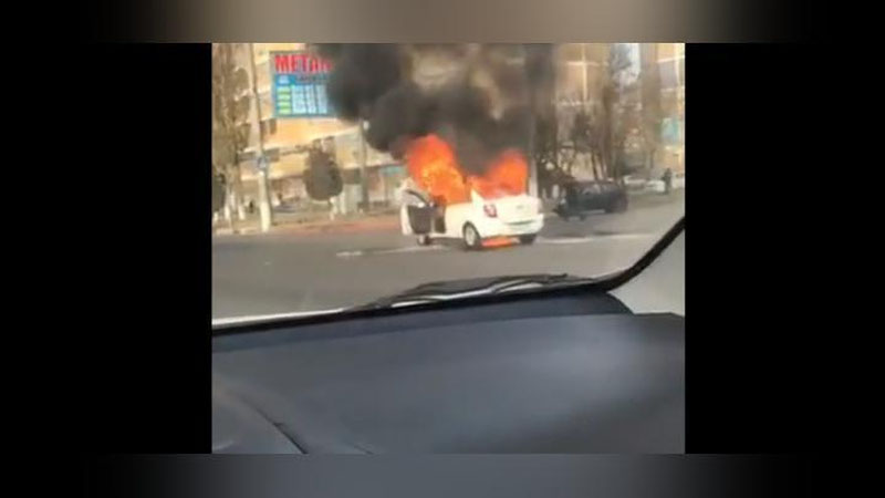 Происшествие случилось на перекрестке на массиве "Кушбеги". На ролике можно увидеть, что пламя охватило салон автомобиля полностью.