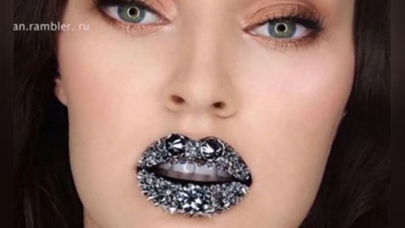 Сначала на губы нанесли черную матовую помаду, а потом с помощью клея для накладных ресниц приклеили алмазы. На это ушло два с половиной часа.