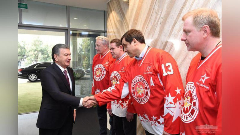Перед церемонией он встретился с легендами российского хоккея, которые обещали помочь Узбекистану в развитии хоккея.