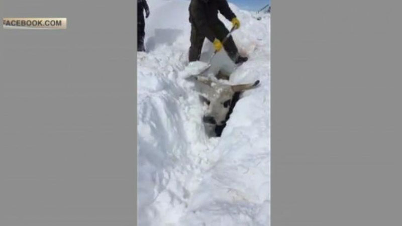 Из-за обильного снегопада на ранчо в американском штате Южная Дакота коровы оказались под двух с половиной метровым слоем снега. Их пришлось откапывать.