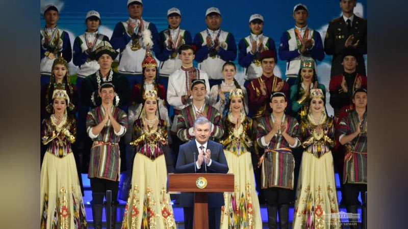 Для меня большая честь от всей души поздравить всех вас, собравшихся в этом величественном дворце «Хумо» в центре столицы, и в вашем лице весь многонациональный народ Узбекистана с праздником Навруз.