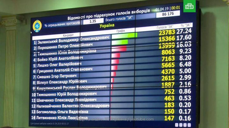 Шоумен Владимир Зеленский лидирует в первом туре выборов президента Украины с 30,02 процента голосов, свидетельствуют данные ЦИК после обработки 25,31 процента бюллетеней.