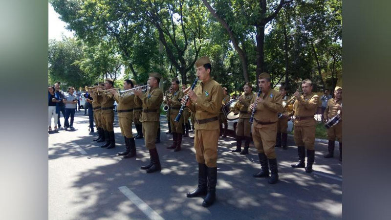 По улицам Ташкента, как и в прошлом году, проходит военный оркестр, исполняющий мелодии и марши военных лет.