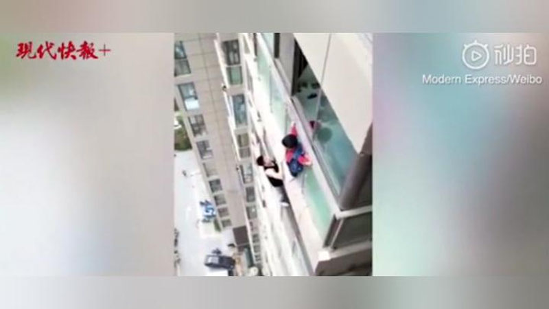 В китайском городе Суцянь, провинция Цзянсу, ребенок чуть не погиб, повиснув на карнизе балкона 14-го этажа.