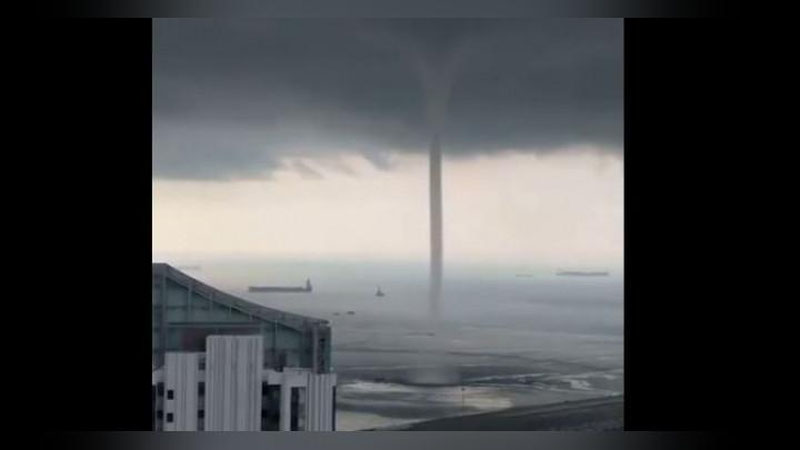 Мощнейший смерч обрушился на Сингапур: огромную водяную воронку закрутило столбом до неба в море недалеко от делового района и паромного терминала Танджонг Пагар.