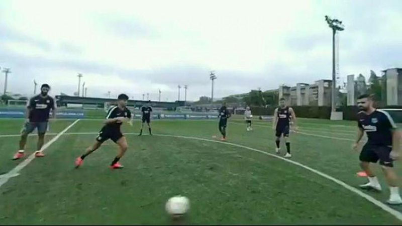 На кадрах капитан команды приходит на тренировку, раздает автографы болельщикам, забивает голы и приветствует Луиса Суареса.